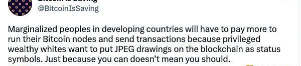 擁有近30萬粉絲的比特幣社區KOL「BitcoinisSaving」認為,NFT頭像是一種特權身份象征,只有那些富裕的投資者才有機會獲得,如果網絡費用大幅增加勢必會把更多邊緣人群排除在比特幣網絡之外,不利于推動加密采用。
