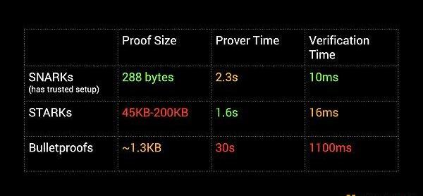 SNARKs(SuccinctNon-interactiveARgumentsofKnowledge)特點:簡潔證明大小,證明驗證耗時相比較短,但需要對每一個電路進行可信設置。代表項目:Groth16。