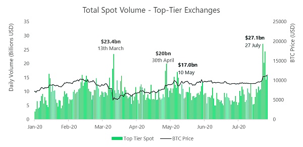 “在當前的牛市行情中,現貨交易量在7月底再次回升。CryptoCompare在7月份更新了交易所的基準排名之后,數據顯示,風險較高的交易所交易量普遍減少,因為用戶開始轉向風險較低的(頂級)交易所。”