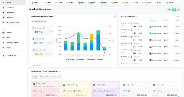 Eigenphi是一個針對DeFi的流動性分析的工具,主打MEV交易及其關聯分析。目前EigenPhi提供實時的MEV數據,包括套利、三明治攻擊、清算、閃電貸行為的實時監控數據,同時還提供當前交易熱度最高的代幣和流動性資金池的相關交易數據,以及對惡意代幣的識別。