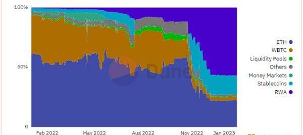 不相關且可能反向相關的收入流為DeFi協議帶來了可觀的收益。在當前傳統金融市場環境下,我們看到了利率上升。但在DeFi經濟中,我們看到利率下降。雖然MakerDAO正處于RWA之旅的開始,但他們已經從RWA中獲得了60%的收入,使他們能夠維持運營,并在非常悲觀的加密市場環境中進行再投資以實現增長。