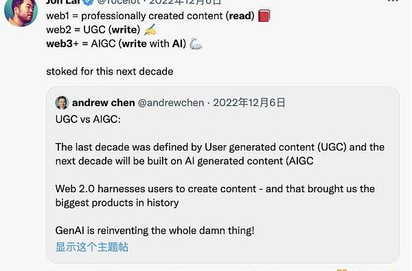 與此同時,DALL-E、StableDiffusion、Midjourney、ChatGPT等眾多AI模型的集中式爆發,也開始讓部分人轉變想法,他們開始認為Web3的定義應該是AIGC。