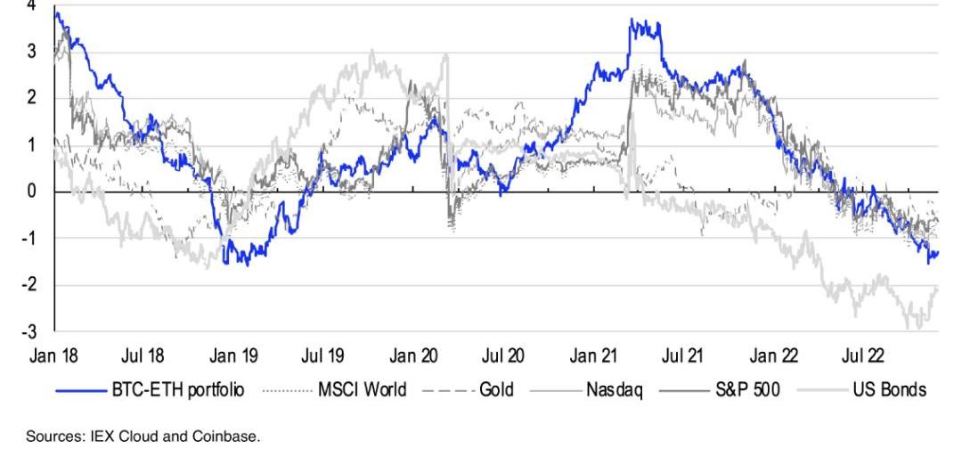 然而,從夏普比率的角度來看,縱觀2022年,Crypto的風險調整后回報,實際上與美國和全球股票指數表現一致,而且表現遠好于美國債券。在11月份的崩盤之前,一個由BTC和ETH組成的等權重Crypto籃子的夏普比率為-1.08,而美國股市的平均回報率為-0.90。這與上一個Crypto冬天觀察到的趨勢有很大的不同,當時數字資產在2019年期間和2020年初的表現,幾乎低于所有傳統風險資產。