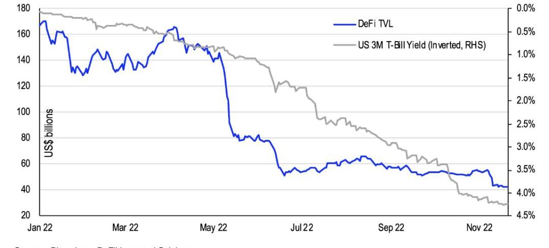 圖5:?DeFi?中的?TVL?對比美國?3?個月期國債收益率