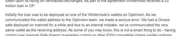 第一個離譜操作發生在6月,但故事的主角并非Optimism,而是抵押5000萬美元借款2000萬枚OP用于做市的做市商Wintermute,由于團隊內部失誤,Wintermute向Optimism提供了一個在以太坊主網部署的GnosisSafe多簽錢包地址而非事先準備好的Optimism地址。這個離譜的失誤使得一名黑客通過重放攻擊盜取了這2000萬枚OP。之后黑客將100萬枚OP交易為以太坊,100萬轉至以太坊創始人VitalikButerin地址,并退回了1700萬枚OP。最后,Wintermute表示會退還剩余的200萬枚OP,故事至此結束。