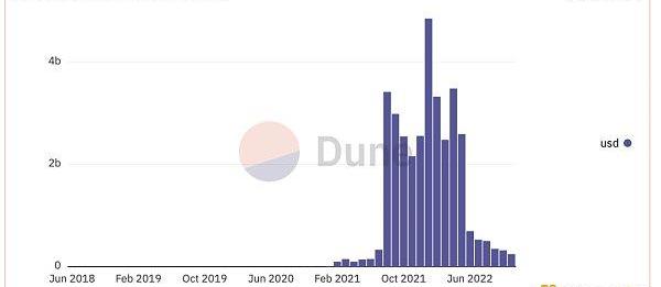 NFTFI的誕生與NFT息息相關。NFT市場從2021年2月開始受到關注,再到8月推到高潮,22年1月到達了頂峰,Opensea當月交易額達到48億美元。但是隨著整個加密市場開始拐頭向下運行,NFT市場也不可避免受到波及,交易量和交易額開始快速下跌,經歷了一個從暴漲到暴跌的過程。