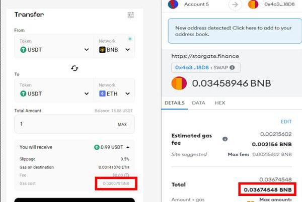 Eg:以BNBChain>Ethereum轉賬1?USDT為例,如下圖顯示,Stargate?會直接在交易頁面顯示?0.036075?BNB的”Gascost”,用戶進行?1?USDT?的轉賬,在扣除源鏈Gas?之后,需要付出的跨鏈手續費則高達?10?美金。