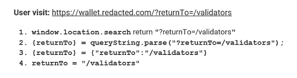 Sink是處理來自Source的非可信數據的地方,因此Sink在這里是:“window.location.href”,如果用戶輸入“returnTo=/validators”。錢包返回到“/validators”, 即轉到驗證者頁面。如果輸入“returnTo=javascript:alert(1)”,將在瀏覽器中彈出alert窗口。