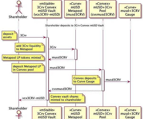 EIP-4626標準的強大之處在于,在投資池中有一種通用的投資方法,但對資產可以投資到底層平臺的內容和時間沒有限制。對于mStable的3CrvConvxmUSD金庫來說,3Crv被添加到CurvemUSDMetapool中,然后產生的流動性提供者代幣(musd3Crv)被存入ConvexmUSD池中,該池會投資于CurvemUSDgauge并獲得更高的回報。