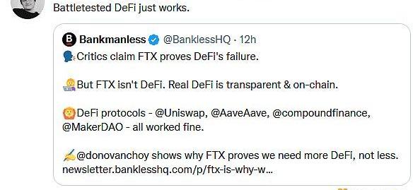 "有了DeFi就不會發生這種情況"。"這就是為什么我們需要遠離中心化的交易所,轉向DeFi的原因"。"FTX的問題是CeFi的,不是DeFi的"。