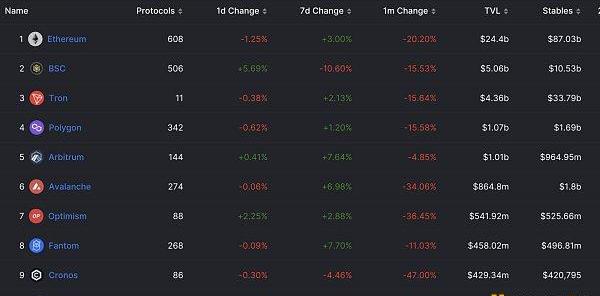 從上述圖表可以看出,DeFi的TVL方面,Arbitrum排名第五位,其前面僅有以太坊、BSC、Tron以及Polygon,超過Avalanche、Solana等,而Optimism排名第八位,也超過了多數公鏈。
