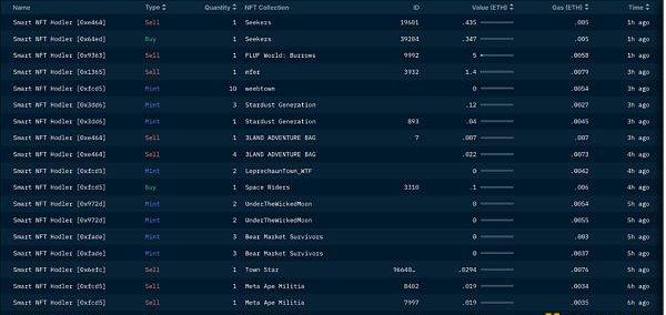 一個很好的入門方法是查看我們在NFTParadise上的SmartMoney選項卡,查看來自SmartMoney地址的最近交易,看看他們在做什么。您甚至可以專門針對SmartNFTHodler標簽和您正在查看的活動類型進行篩選,以獲得更好的視圖。提醒下,如果您看到一部分聰明的NFT鉆石手都開始賣某類NFT,可能這是一個潛在的「退出」信號,反之亦然。