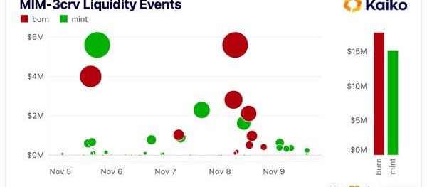 這種影響也已經蔓延到了以太坊。人們很快意識到,FTT是抵押穩定幣MIM的一個主要支撐。鏈上調查顯示,其中大部分是Alameda的頭寸,當FTT達到6美元時,它將被清算。在這個消息中,MIM的掛鉤開始動搖,盡管該團隊很快宣布,它正在與Alameda合作,以減少他們的貸款規模。隨后,MIM回到了穩定的掛鉤,并沒有看到其CRV池強烈資金流出,過去幾天的MIM銷毀量只比鑄造多一點。