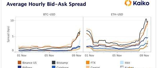 Alameda的破產可能已經影響到流動性,在過去的兩天里,BTC-USD訂單上的比特幣數量從所有市場的約6000個下降到4000個。