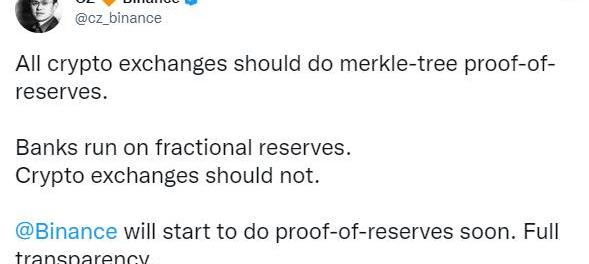11月9日,CZ在其平臺發文稱??Binance?將很快開始進行默克爾樹儲備證明,保證資產完全透明。當前銀行依靠部分準備金運作,但是