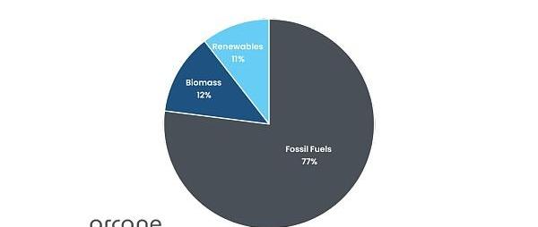 化石燃料是最常見的供熱能源,約占能源結構的四分之三。剩下的四分之一基本平均分配在傳統生物質能和現代可再生能源之間。