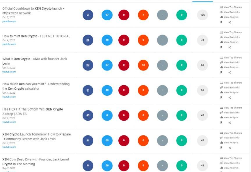 雖然Twitter在social流量中占據大頭,但目測Youtube才是項目預熱階段原創內容的生成平臺,并進一步在Twitter上傳播,從而帶動傳播。下圖截取了buzzsumo平臺對“XENCryto”的關鍵詞抓取記錄,會發現,在10月8日發布日前,項目方在YouTube平臺做了密集的內容布局,或者可以理解為對潛在受眾的training,這里面的內容布局有如下幾點值得關注和借鑒: