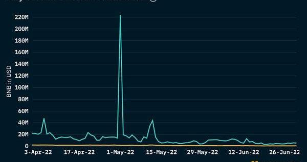 BNB鏈是交易數量最活躍的智能合約區塊鏈,甚至讓以太坊相形見絀。盡管交易量在第二季度略有下降,但仍是以太坊的3-6倍,在5月12日的UST取消掛鉤事件期間達到980萬筆交易的峰值。盡管一些這可能歸因于機器人活動,BNB鏈仍然是一個受歡迎的零售鏈,其價格已超出以太坊的價格。