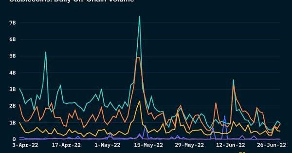 接近季度末,USDT、BUSD和USDC的日鏈上交易量比較接近,USDT交易量自峰值以來下跌了87.29%,而BUSD和USDC交易量分別下跌了80.93%和79%。還值得注意的是,TrueUSD在6月初曾達到1.4b美元的峰值,但在本季度末只有大約100萬美元,下跌超過99.93%。