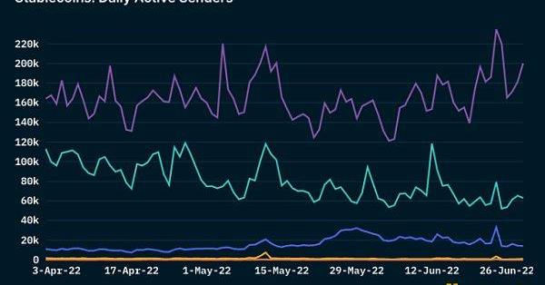 鏈中的每日穩定幣交易量是另一個重要指標,可用于評估該網絡中發生的活動和采用情況。隨著鏈采用的增長,每日鏈上穩定幣的數量也在增加,因為穩定幣是促進代幣交易的基本組成部分。