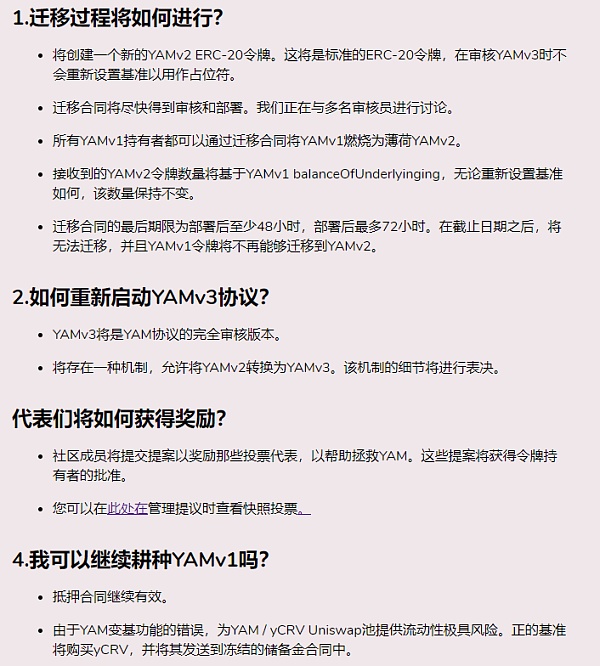 完整的YAM系統將被審核并重新部署為YAMv3。YAMv2持有者將可以通過一個合約遷移到YAMv3令牌。