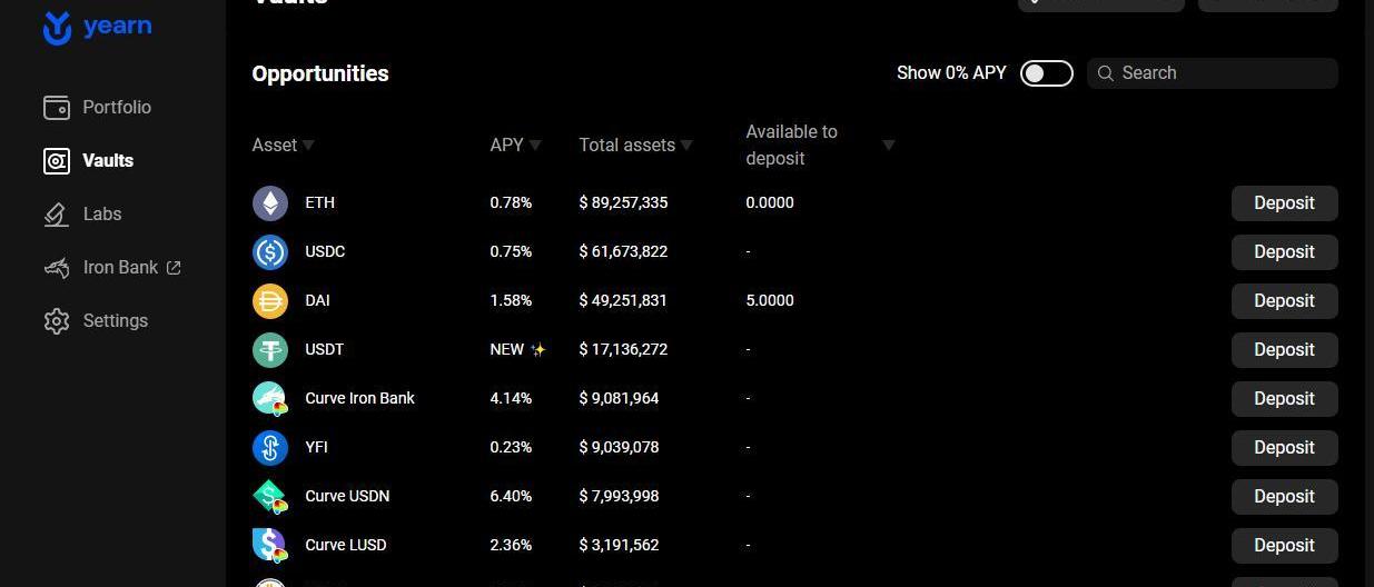 它主要產品是yVaults,投資者可以在其中存入資產以獲得長期的回報。他們有大量可用資產可供選擇,投資者可以通過APY、總資產或錢包中可用的資產來過濾他們的搜索。
