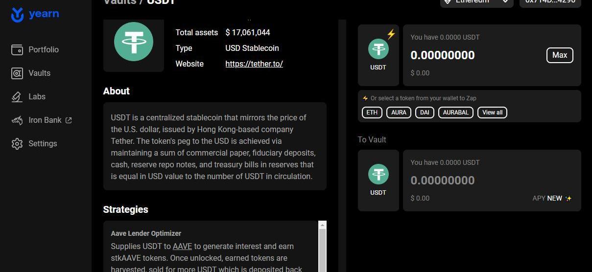 單擊資產圖標時,將打開特定的保險庫頁面,可以在其中找到更多信息,例如與保險庫相關的投資策略描述。每個yVault可以同時處理20個策略。
