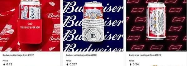 2021年,百威啤酒發行了以品牌啤酒罐為主題的傳承版NFTBudverseCansHeritageEdition,共發行了1936個,而1936對應著百威首次推出罐裝啤酒的年份,當年百威也有了首版品牌LOGO,這些NFT記錄了百威啤酒過往的歷史性時刻、設計照片和罐裝啤酒的發展歷程。