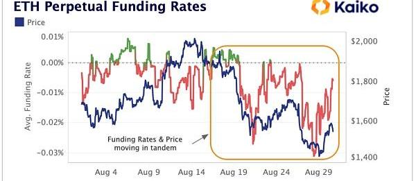 正如我們在下面看到的,空頭頭寸導致的負資金費率伴隨著ETH從2,000美元的水平下跌,并與價格同步移動。如果這些空頭在合并后被平倉,那么ETH資金費率可能會朝著積極的領域邁進,這肯定會有助于價格情緒。
