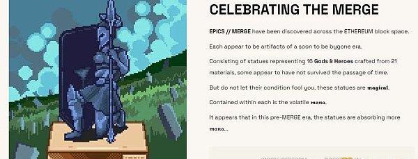 EPICSMERGE是ProofofBeautyNFT工作室為慶祝以太坊合并而創建的鏈上像素藝術項目。EPICSMERGE在以太坊區塊空間中被發現,每一個雕像都是一個即將過去的時代文物。這些雕像由21種元素構成,共有16位神話人物和英雄。有些雕像似乎無法在時間的流逝當中幸存下來,但不要被他們的狀況所欺騙,每一個雕像在合并完成之前吸收更多的法力點,合并之后,他們可以通過提升儀式得到重生。