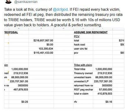 爭議進一步加劇,根據社區成員計算,即使在贖回FEI和完全補償存款人之后,TribeDAO有足夠的資產來完全補償所有受到黑客攻擊的受影響方,同時仍能夠向代幣持有者返還一定的價值,TRIBE代幣價值將為0.16美元。