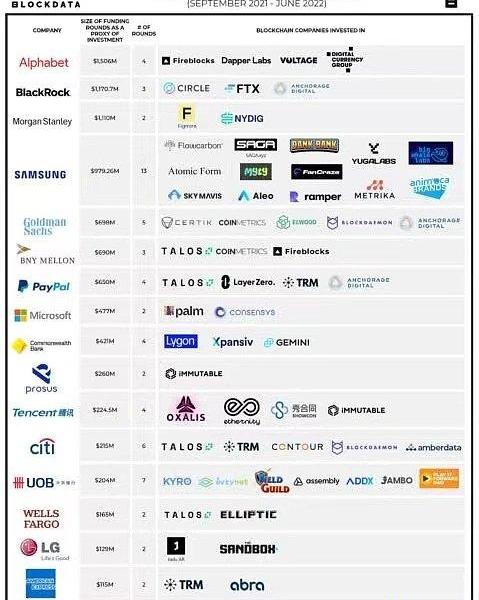 “這40家公司在2021年9月至2022年6月期間向區塊鏈初創公司投資約60億美元。由于有些輪融資涉及多個投資者的參與,目前還不清楚每個公司在一個項目上的投資額。”
