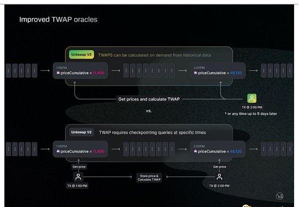 UniswapV3對TWAP預言機進行了重大改進,通過存儲一個累積和的數組,可在單個鏈上調用中計算過去約9天內的任意TWAP,而非局限于一個短周期。
