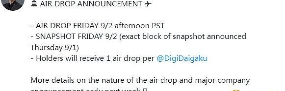 LimitBreak首席執行官GabrielLeydon8月25日發推表示,DigiDaigaku將于9月2日空投,1個DigiDaigakuNFT獲得1份空投,空投更多細節和其他進展將在本周陸續發布。