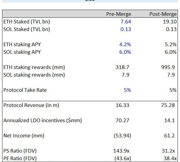流動性質押協議將成為合并的最大基本受益者,甚至超過ETH。LSD協議的收入直接受到ETH價格以及其他多種與合并相關的正向影響,并且影響會相互疊加。此外,在合并后不久,他們最大的支出即在其抵押衍生代幣和原生ETH之間補貼流動資金池的成本實際上下降到了零。樂觀估計ETH協議收入將增加4-7倍,最大支出將減少60-80%。