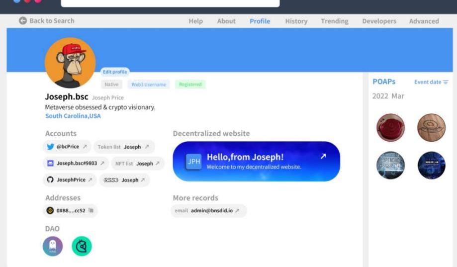 另外,BNS還將搭建基于BNS域名的Web3社交平臺,用戶可以在持有的域名中設置和展示個人資料信息,比如ERC20地址、郵箱,URL鏈接、Twitter、Github、Reddit、Telegram?等的信息;用戶也可以將自己地址持有的ERC-721和ERC-1155標準的NFT設置成Avatar頭像,在鏈上各個DAPP應用中展示。如下所示: