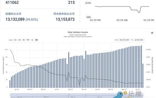 截至7月29日,信標鏈運行平穩。鏈上數據顯示,信標鏈已擁有約41.1萬個節點,累計質押總額約1313.2萬ETH,其中有效投票參與率達99.83%。另外,自2021年10月15日至今,節點數量和質押總額穩步增長,每日驗證者收入也在緩慢增長中,目前,信標鏈每日獎勵量約11萬枚ETH。