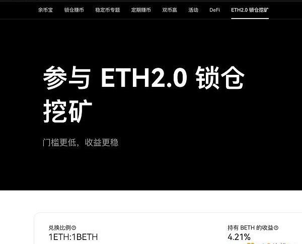 歐易OKX就有提供ETH2.0鎖倉挖礦節點運營商的服務,歐易承擔所有ETH2.0節點的搭建和維護成本,用戶0.1ETH即可參與,且鏈上收益100%發放給用戶。ETH2.0挖礦收益根據鏈上鎖倉量動態調整,預計年化收益率在4%-20%之間。平臺1:1發行挖礦憑證BETH,每日00:00(HKT)對用戶持倉進行快照,按照用戶BETH持倉量按比例瓜分鏈上收益,在次日11:30(HKT)發放挖礦收益。當ETH2.0主網上線后,可以根據持有的BETH數量1:1兌換回ETH。且平臺開放了BETH/USDT和BETH/ETH交易對,當不想持有BETH了也可以隨時賣出,靈活性高。