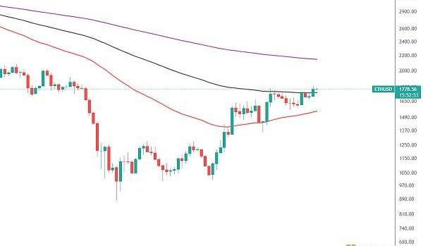 ETH日線再次向上突破,站穩不破后面有望繼續上攻,支撐1735-1740。
