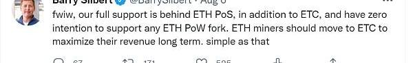 6.DCG:不支持任何以太坊PoW分叉,礦工應將算力轉移至ETCDCG首席執行官BarrySilbert在其社交網站就以太坊分叉事件討論時表示,「我們全力支持以太坊PoS,不支持任何以太坊PoW。ETH礦工應該轉向ETC,以實現長期收入最大化。」