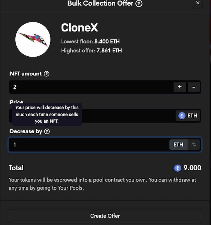 sudoAMM的系列報價其實也相當于創建NFT購買池,可以選擇線性曲線或者指數曲線,與OpenSea等不同的是,由于sudoAMM是鏈上流動性協議,所以報價時所用的代幣會被托管到用戶擁有的池合約中,當然也可以隨時從該合約中提款。