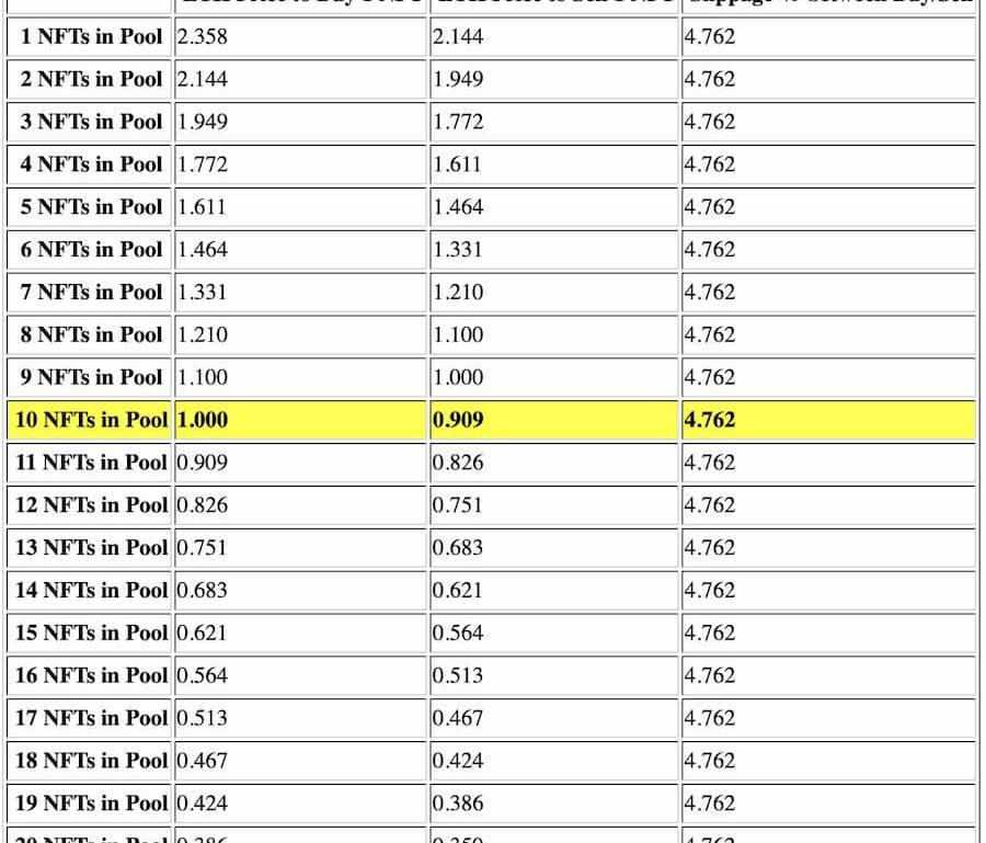 x*y=k池子中,交易者每購買或出售一個NFT時所需的ETH