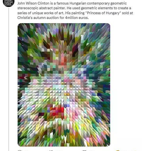 根據Geometricbirds官推的描述:這個NFT項目由一個JohnWilsonClinton工作室發起,JohnWilsonClinton是匈牙利當代著名的幾何立體抽象畫家,他使用幾何元素創作了一系列獨特的藝術作品,其中他的畫作《匈牙利公主》在佳士得秋季拍賣會上以400萬歐元成交。另外,8月12日在匈牙利國家美術館B館會有他的專場藝術展覽。
