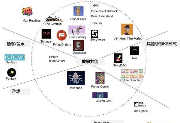 為什么這個mapping會以故事創作為核心呢?因為根據目前不完全的項目統計,發現大多是圍繞創作一個故事展開的,只是形式各異,有文字、圖畫、音頻、視頻等,還有的是各種形式的復合,比如想要打造一個去中心化好萊塢的StoryDAO。還有一些共創項目,其主線并不是要創作故事,這些項目就放在了故事創作圈以外。