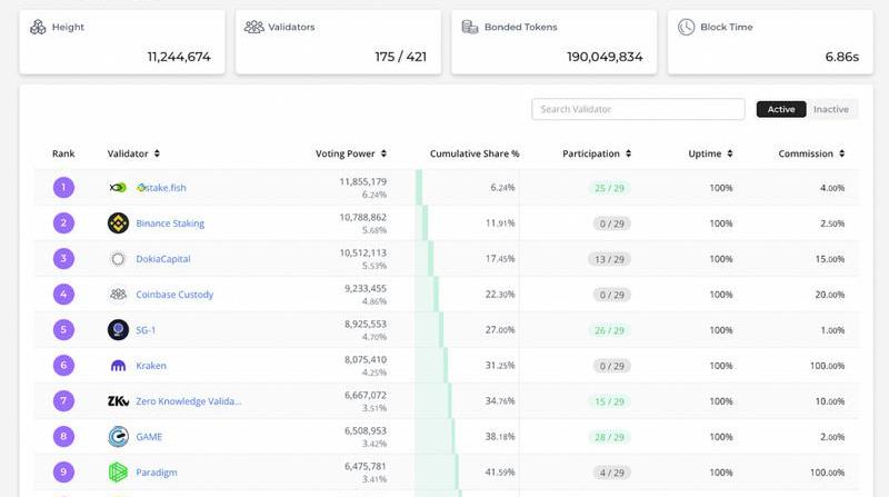 CosmosHub有175個活躍的驗證人,這是通過治理設定的最大上限。該網絡確實采用了委托權益證明(DPOS)(譯者注:應該是BPoS),token持有者可以將其權益委托給這些驗證人之一,以賺取與保護網絡相關的回報。