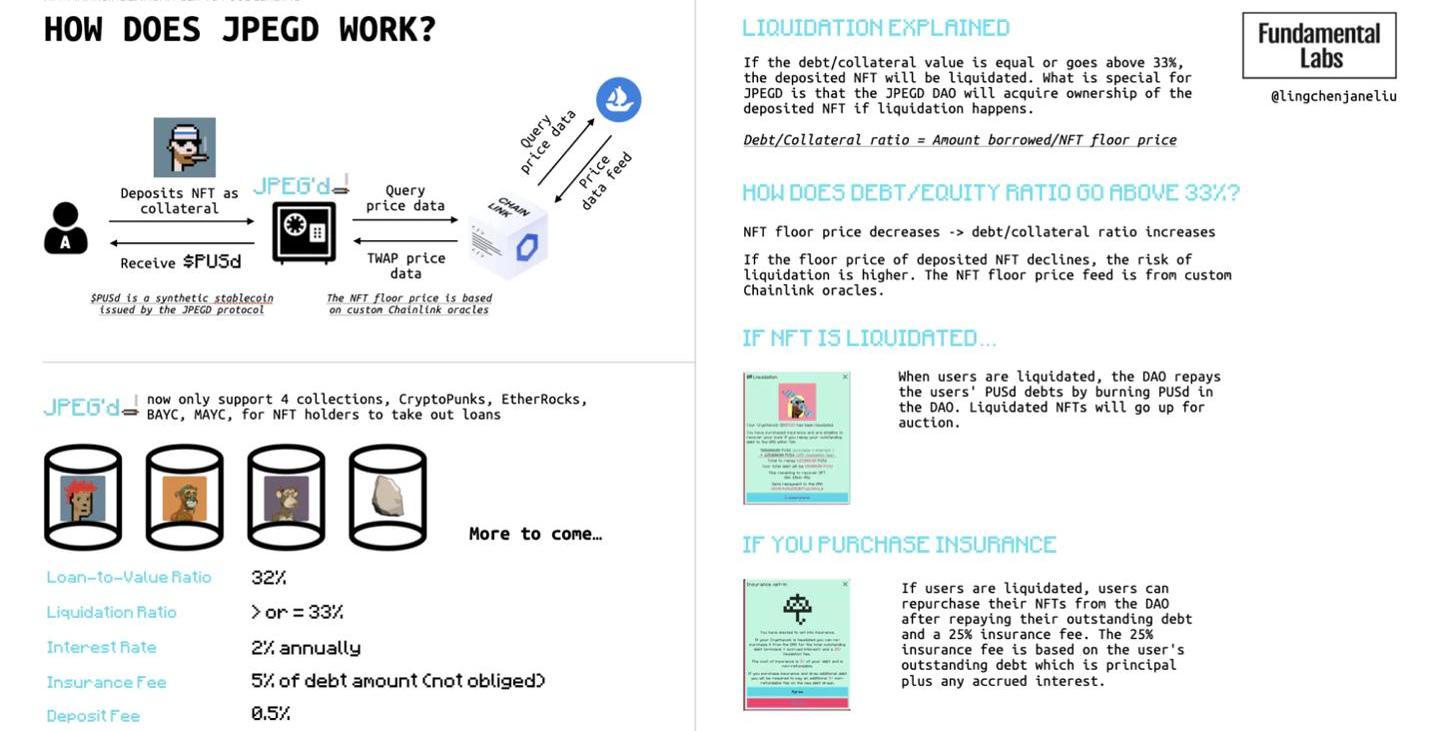 JPEG'd使用的點對池機制使借款人能夠立即獲得貸款。用戶可以存入NFT如CryptoPunk,以借用JPEG的$PUSd穩定幣。JPEG則使用自定義Chainlink預言機來獲取和維護其NFT抵押品的鏈上實時定價。