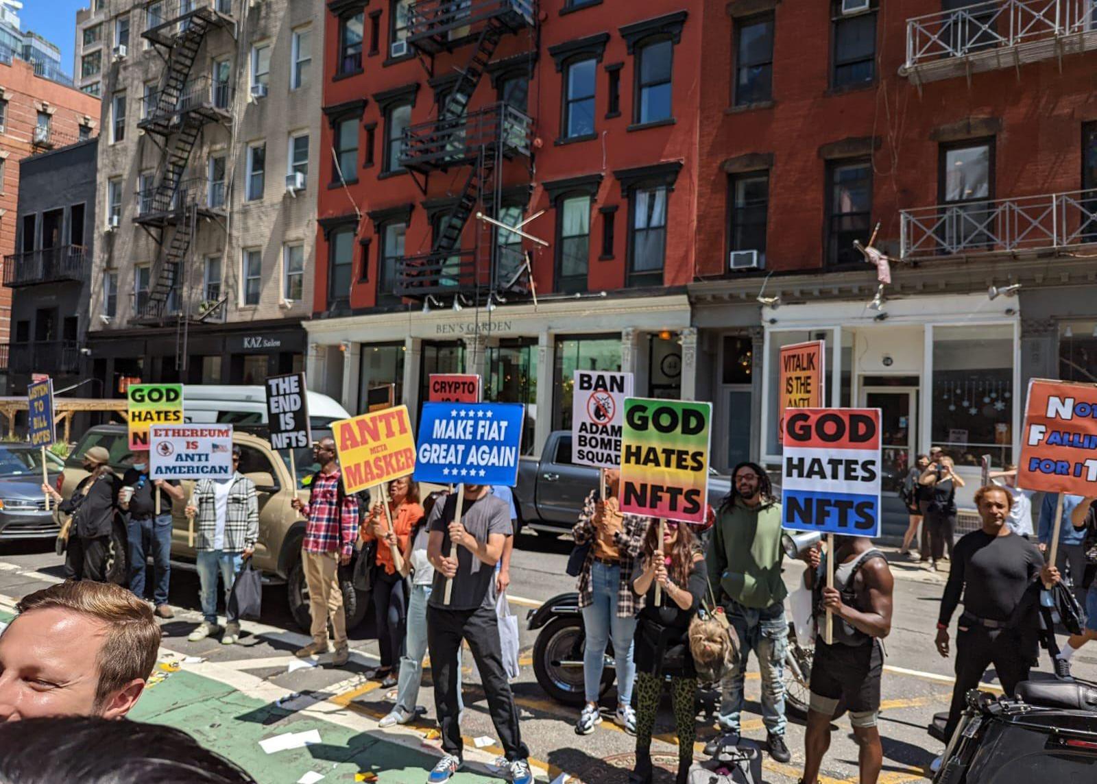 6月20日,被Coinbase譽為「NFT世界的超級碗」的NFT.NYC盛會在紐約盛大開幕,無數來自世界各地的NFT玩家前來「朝圣」。而在會場外,卻有一群「不懷好意」的抗議者正在聚集。他們舉著各式各樣的抗議標牌,其中數量最多、最引人注目的就是「GODHATESNFTS」。
