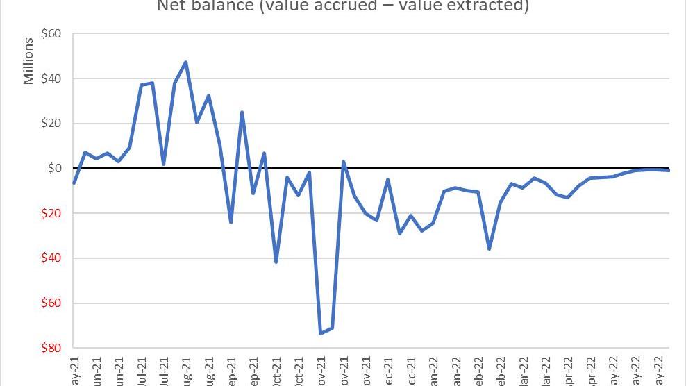 假設所有SLP凈產出的75%被售出。從圖中可以看出:從2021年9月下旬到今天,從經濟系統中提現的價值都超過了財庫的累計價值。