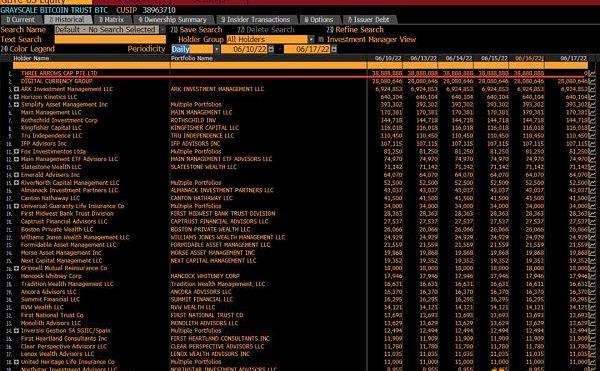 6月18日,彭博終端一度將3AC的GBTC持倉清空為0,彭博社給出的理由是,21年1月4日以來,3AC沒有提交13G/A文件,他們找不到任何確認三個箭頭仍然持有$GBTC的數據,并將其作為陳舊數據刪除。