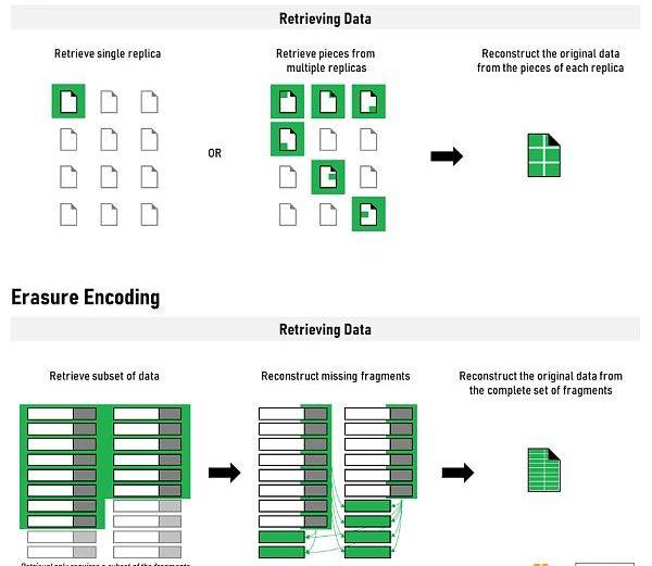 在這些網絡中,有兩種主要的方法用于在網絡上進行存儲數據:存儲完整文件和使用糾刪碼:Arweave和CrustNetwork存儲完整文件,而Filecoin、Sia、Storj和Swarm都使用糾刪碼。在擦除編碼中,數據被分解成固定大小的片段,每個片段都被擴展并用冗余數據編碼。保存到每個片段中的冗余數據使得只需要片段的一個子集來重建原始文件。